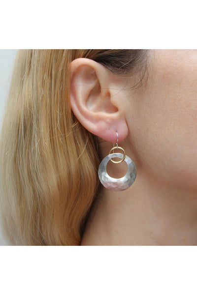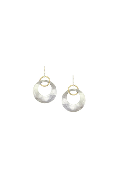 A brass ring interlocking a silver cutout disc with faceted hammering. A beautiful and wearable wire earring with eye-catching texture.