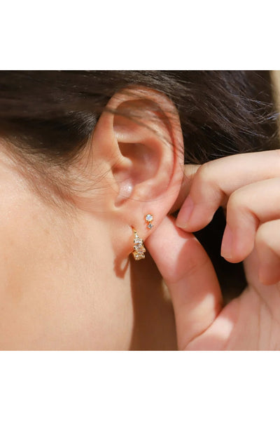 Add a twist to your look with these Baguette Huggies. Featuring stacked baguette CZ stones, these huggies are your go-to for instant glam. Whether you're dressing up or keeping it casual, these earrings bring bold energy to any outfit.