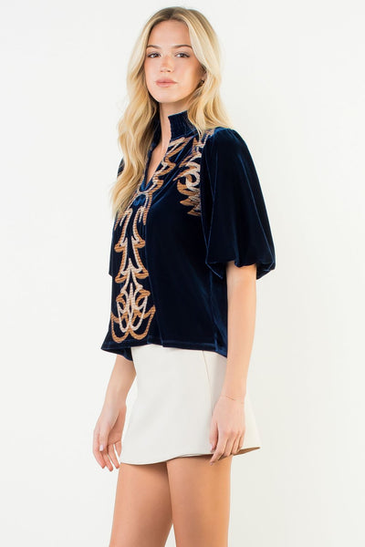 THML - Puff Sleeve Velvet Embroidered Top - Navy