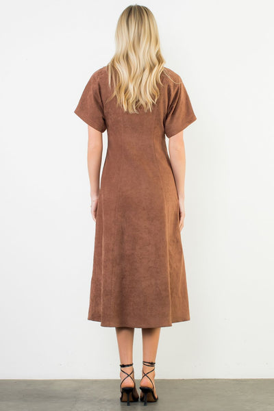 Effortlessly chic and undeniably soft, this short-sleeve suede dress features a flattering v-neck collar and hits right at mid-length for that perfect balance of sophistication and ease. The luxe suede fabric drapes beautifully while the relaxed silhouette keeps things comfortable all day long.