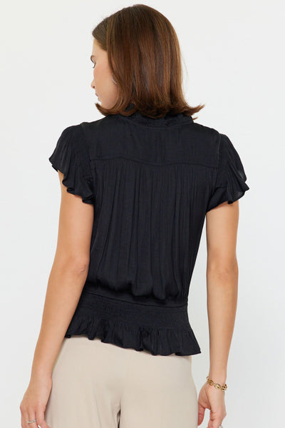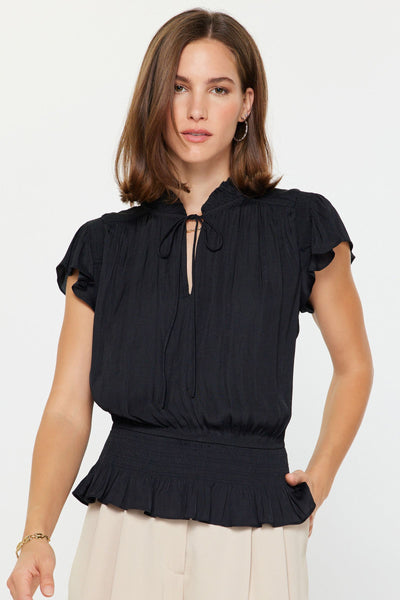This charming blouse brings effortless elegance with its split neckline and self-tie detail—perfect for dressing up or down. Flutter sleeves with shirred shoulders create a flattering silhouette, while smocking and ruffles at the hem and neckline add playful texture and movement. The relaxed peplum fit skims your curves beautifully, making it ideal for everything from brunch dates to casual office days.