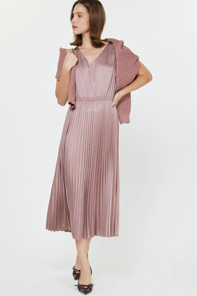 Set yourself ahead for the season with this neutral-hued look. The pleated dress and long-sleeve pullover sweater work together as an effortless pairing.