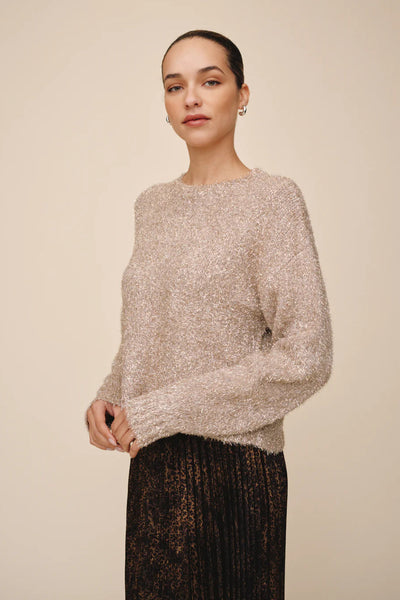 The Shimmer Slouchy Sweater is a laid-back knit that's anything but boring. Crafted with soft, relaxed proportions and woven with delicate shimmer threads, this piece catches the light beautifully while keeping you wrapped in comfort. The timeless crew neckline pairs seamlessly with everything from jeans to skirts.