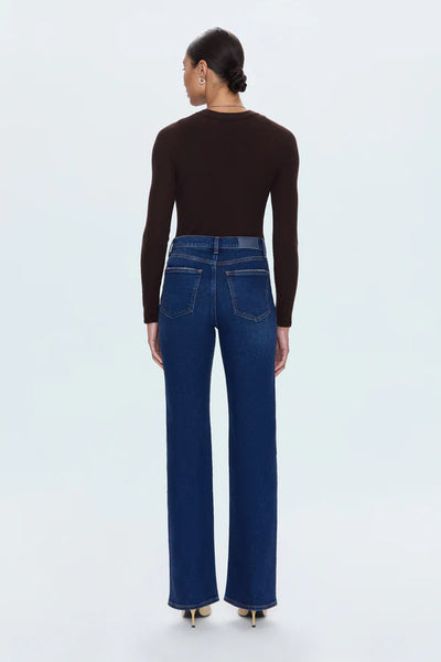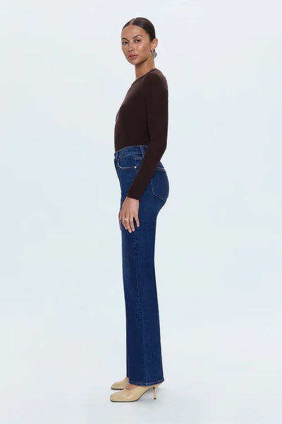 The Evie High Rise Slim Boot features a flattering silhouette that sits high on the waist with a sleek, slim fit through the hips and thighs. It transitions into a subtle bootcut that creates an elongated, refined line. At 33 inches, the full-length inseam works beautifully with both heels and boots, offering sophisticated versatility for any occasion.