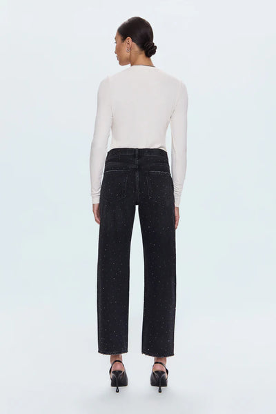 Meet Lexi, a refined denim essential defined by its mid-rise cut and distinctive bowed straight silhouette. The subtle knee curve provides both dimension and comfort, while the 29" inseam concludes in a crisp, cropped ankle. Rendered in rigid Silver Screen denim—a sophisticated black wash studded with micro rhinestones—Lexi delivers understated glamour with every step.