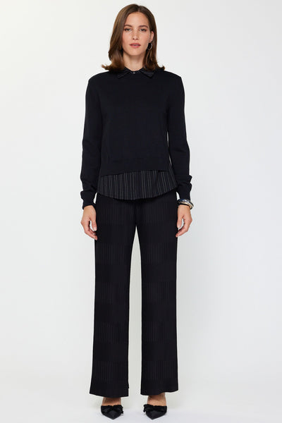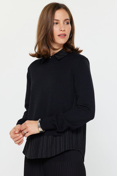 Layer up with unexpected style in this clever combo sweater that pairs a cozy knit with a crisp pinstripe shirt. The spread collar adds a polished touch while the woven shirt front keeps things fresh and preppy. Perfect for when you can't decide between comfort and put-together vibes—this piece lets you have both.