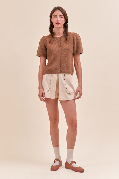 This short puff sleeve sweater cardigan brings a fun twist to cozy style. Featuring a ribbed round neck and charming puff sleeves, it buttons down the front for easy layering. Its relaxed fit makes it perfect for playful days and casual outings alike.