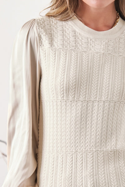 The Woven Sleeve Combo Sweater features a textured knit bodice paired with long woven sleeves that gently billow from pleated shoulders, creating a refined silhouette. Ribbed detailing at the crew neckline, hem, and cuffs enhances the tailored finish.