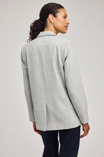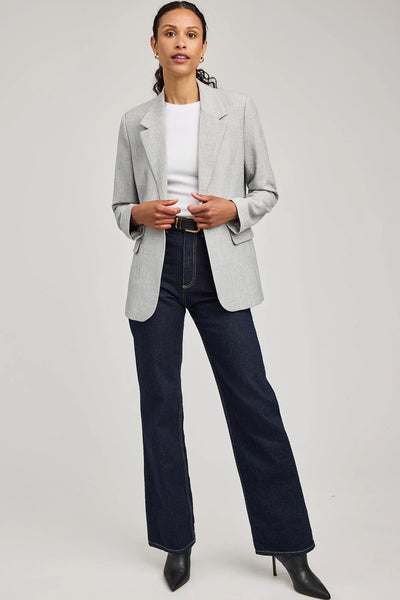The Jeanie blazer is made of a heathered twill suiting fabric and is fully lined for ease of wear. Features include a tailored yet relaxed fit, button front closure, and pockets.
