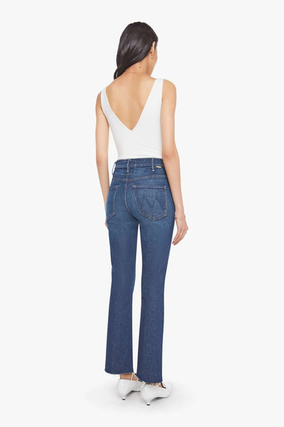 These high-rise flares boast a zip fly and a flirty 28.25-inch inseam, finished off with a cool frayed hem. Crafted from semi-rigid SUPERIOR denim in a dark blue shade, they feature subtle fading and whiskering for just the right amount of vintage vibe.