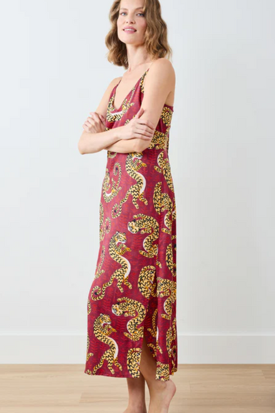 Unleash your inner wildcat in the Twisted Tiger Sleep Nightie. The rich Merlot hue and striking tiger print command attention, while the body-skimming cut flatters your silhouette. Adjustable straps and a stretchy smocked back ensure the perfect fit every night, and a graceful side slit keeps things moving.